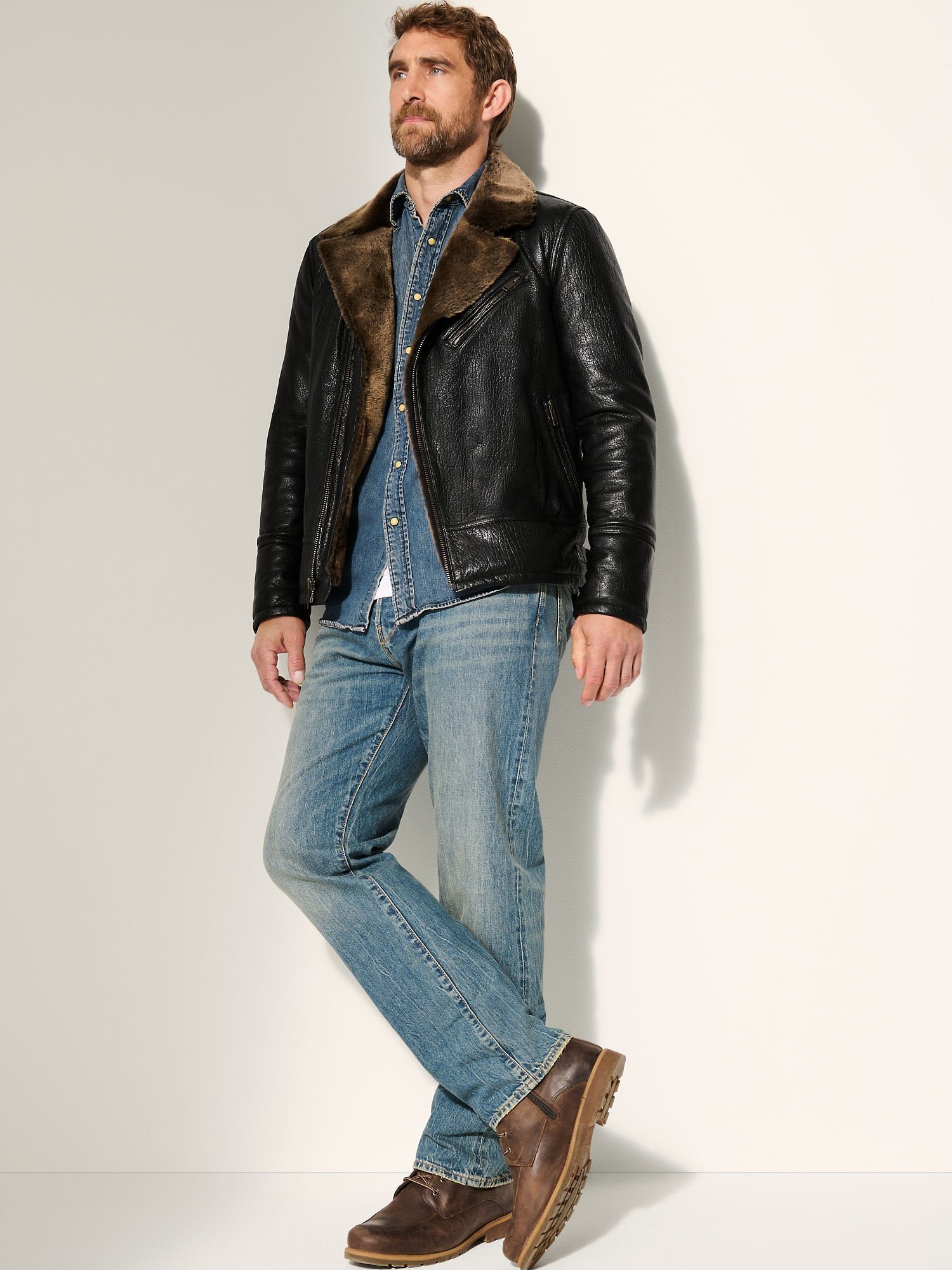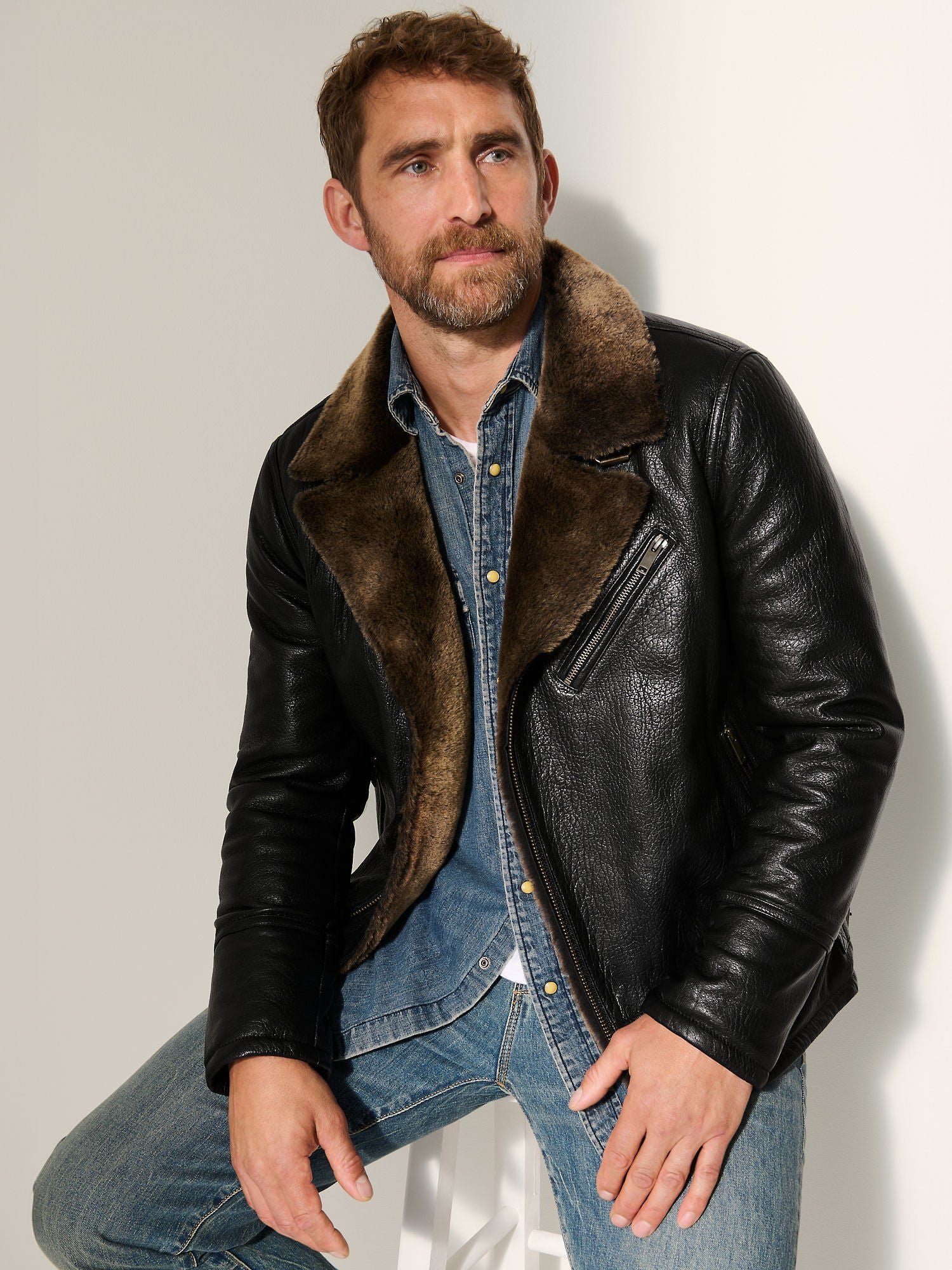 Made from rugged yet supple leather, the Axel moto jacket channels the exhilaration of open roads and bold horizons. It’s precisely tailored form and lightly textured finish add dimension, while the asymmetrical zip front accented with shearling that runs from the waist to the top of the notch collar adds a tactile touch to this iconic design.