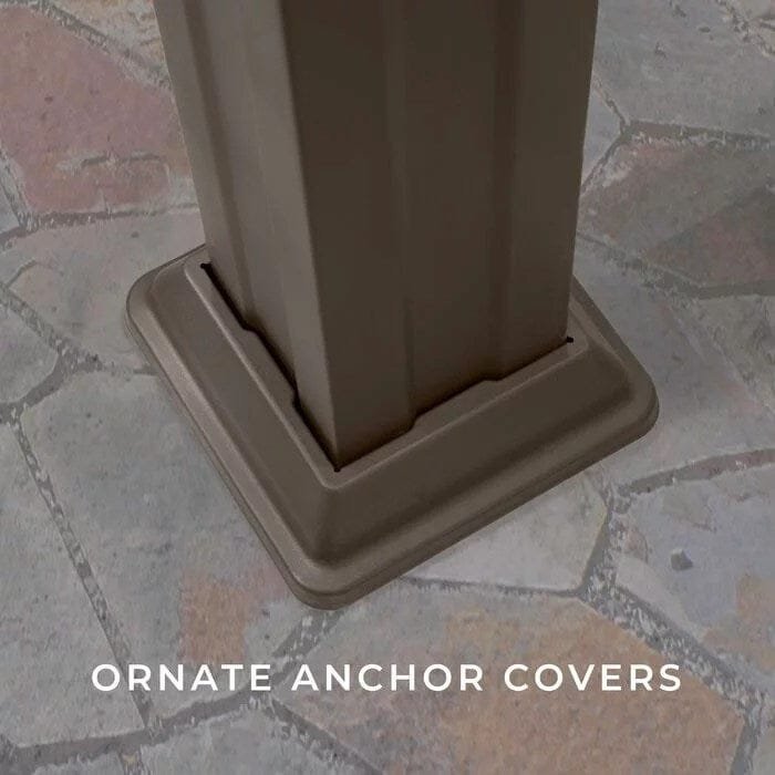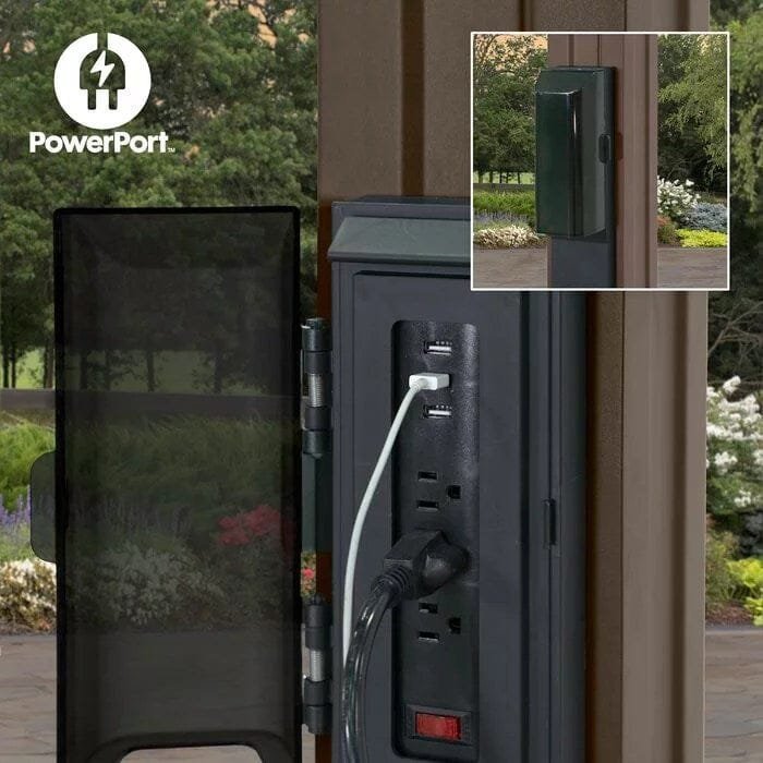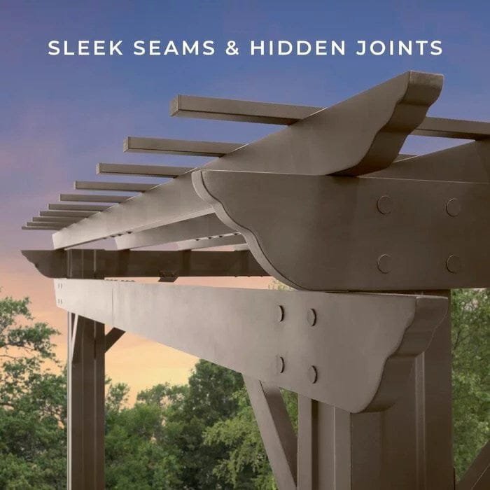 This newest state-of-the-art addition to our patio collection, in a Classic Brown Finish. Our powder-coated, galvanized steel construction makes the Ashford pergola maintenance-free and rust-resistant while offering protection against chipping, scratching, corrosion, and UV harm. This preserves the classically inspired appearance of a traditional outdoor structure design with modern, durable steel composition. Backed by a 5-year limited warranty, our high-quality steel pergolas provide market-leading strength and durability in comparison to aluminum or vinyl outdoor shade products. Offered in 3 sizes, the Ashford steel pergola provides up to 120 sq. ft. of shade and plenty of room for furniture, fire pits, and entertaining. The exclusive Power. Port has 3 USB ports and 3 electrical outlets to use for powering outdoor lights and electronics as well as charging your devices. If you have been searching for a strong, weather-resistant, traditional-styled pergola, look no further.