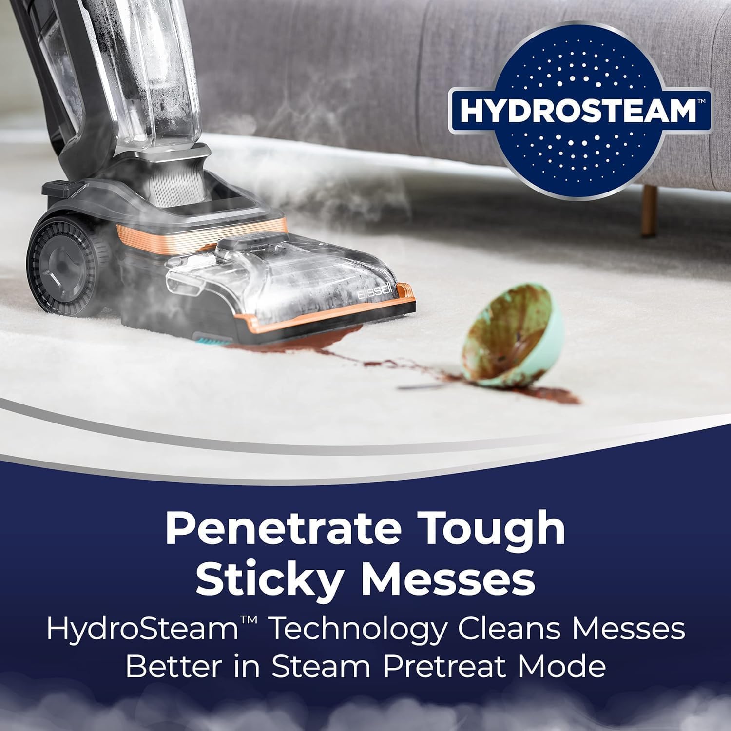PENETRATE TOUGH STUCK-ON & STICKY MESSES. HydroSteam Technology cleans messes better with Steam Pretreat Mode.
