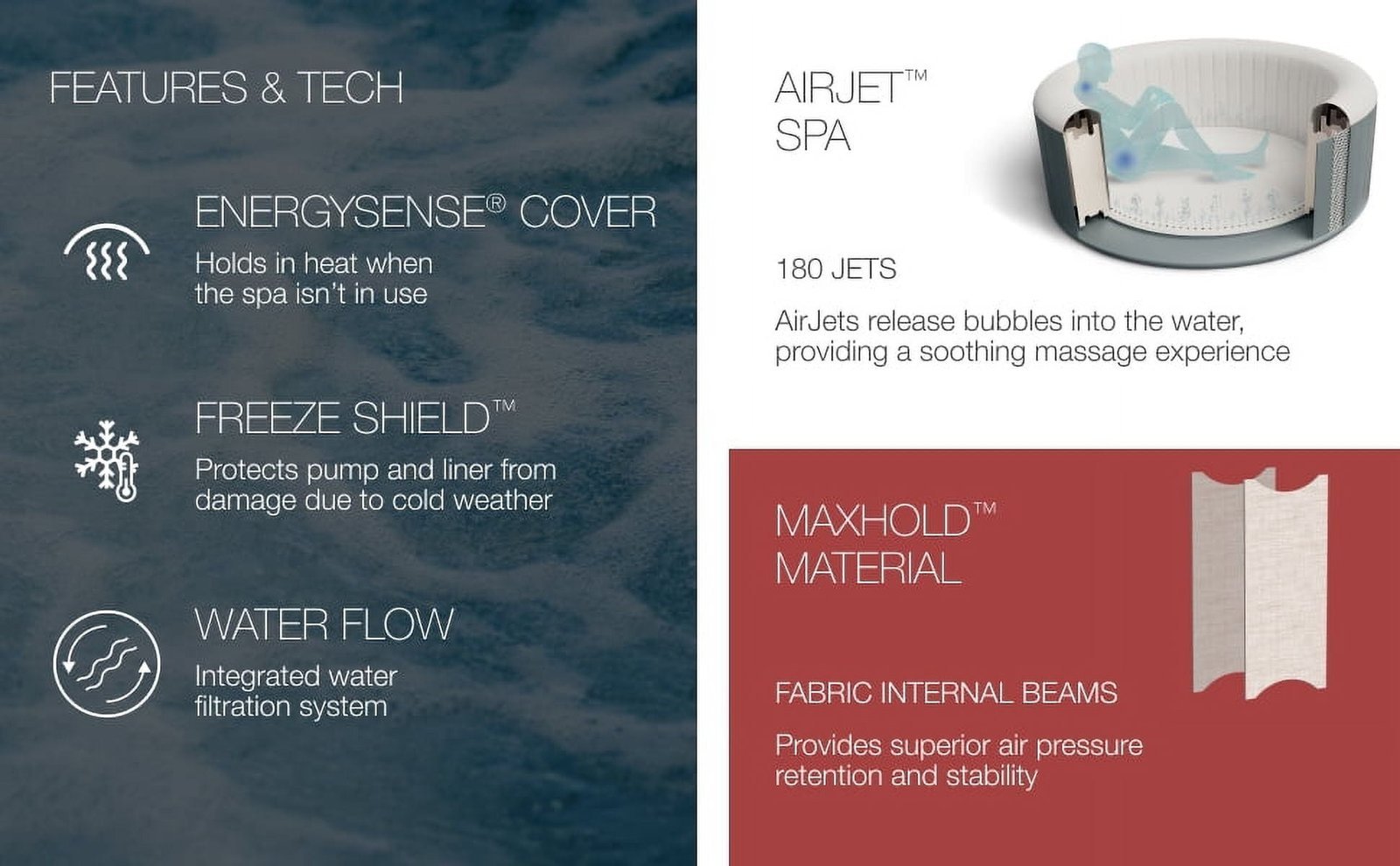 Equipped with a pump that quickly inflates the spa, heats it up, runs filtration, and controls the massage system