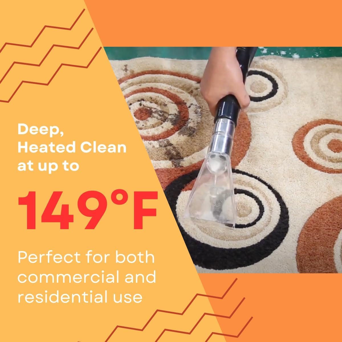 Heated Water: The machine heats water to high temperatures (149°F), which helps break down stubborn dirt, oils, and stains more effectively than cold water, heat softens tough stains like grease, coffee, and grime, making them easier to lift from fibers.