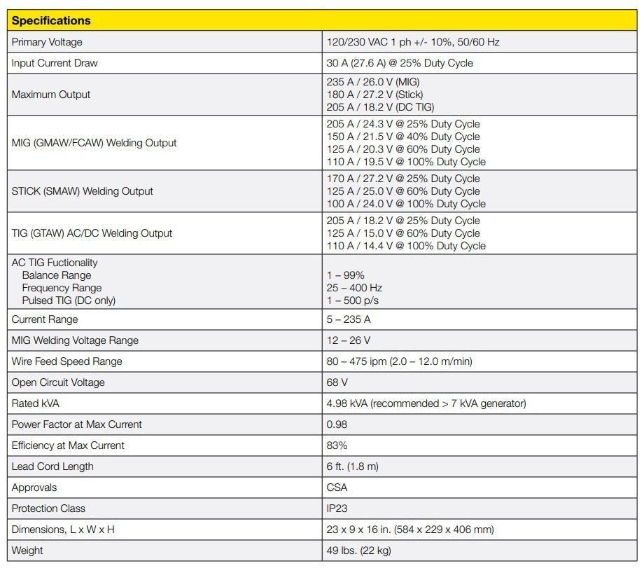 Quick Specs • Input Power: 120V/230V • Current Range: 5-150A (120V), 5-235A (230V) • Wire Diameter Capacity: .023″-.045″ • Weight: 49lbs • Dimensions: 16″ H x 9″ W x 23″ D • Max Plate Thickness: 3/8″ • Generator Requirement: 3.7 kVA (110V) | 7.5 kVA (230V) • Warranty: 3 years on power source, 1 year on torch