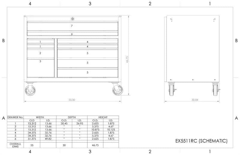 We have taken great care in designing the features you really want. The 55 In. 11 Drawer Professional Roller Cabinet includes exclusively patented features which cannot be found anywhere else and give you the most for your hard-earned money. Whether you have screwdrivers and ratchets or a 48 In. pry bar, there is a place for everything. Our double steel wall drawer front design gives greater strength to each drawer and hides interior dents from tools. Drawer back panel is designed for rigidity to allow the drawer to hold more weight without sagging or flexing. You will see no spot welds on our drawer fronts, hutch or side cabinets. The 30 In. deep roller cabinet has a self-adjusting spring lever action for increased security and smoother drawer action. Exclusive modular drawer design allows the drawer configuration to be rotated and arranged to suit your needs. Top sub-weldment keeps the top of the box rigid and stable. Roller cabinets come standard with an upgraded stainless steel top work surface. Four 6 In. x 2 In. casters (2 locking swivels and 2 rigid) load rated 950 lbs. each. 2 Extra long drawers and 2 extra deep drawers to accommodate hard-to-fit tools. Shipping Weight: 1,000 Lbs.