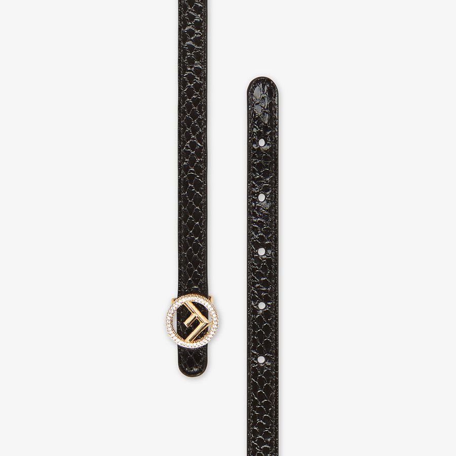 Slim belt with round buckle in the F is Fendi logo shape. Stud buckle fastening. Made of black elaphe. The buckle is embellished with mounted white zircons. Gold-finish metalware.Made in Italy