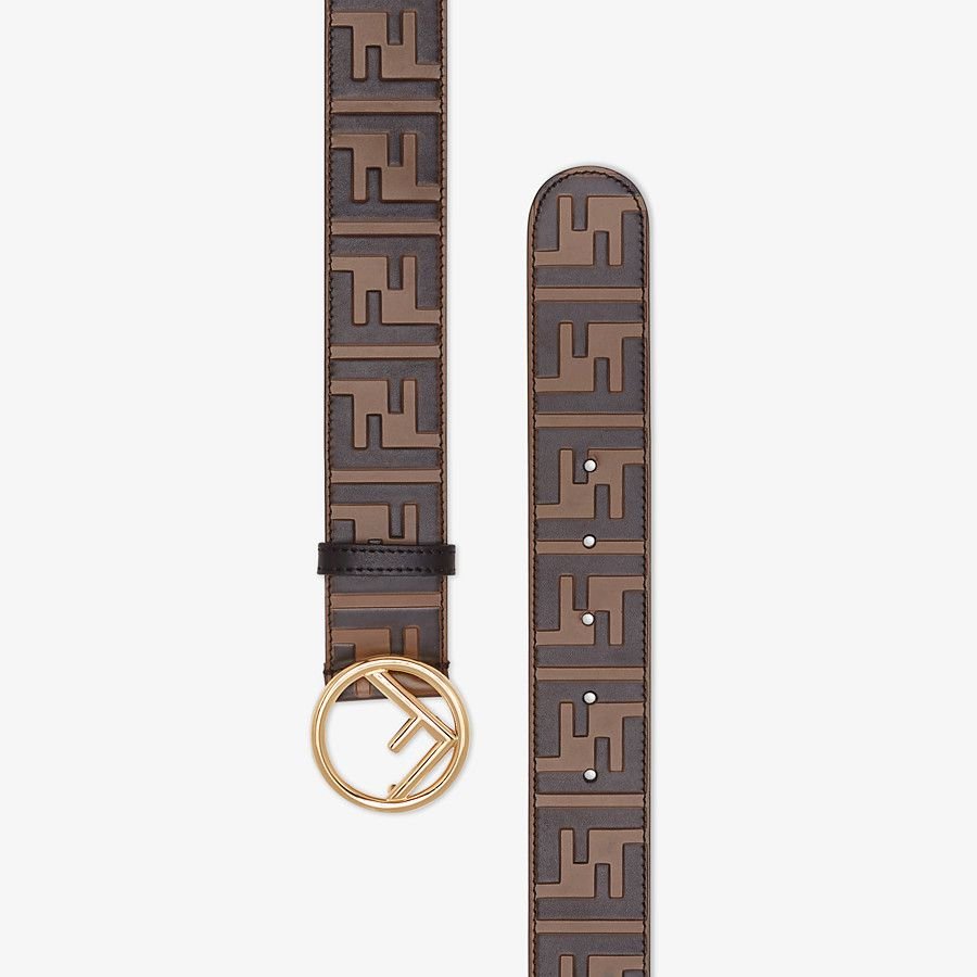 Wide belt with buckle in the shape of the F is Fendi logo. Stud-buckle fastening. Made from brown leather. Finished with embossed and hand-painted FF motif.. Gold-finish metalware.Made in Italy