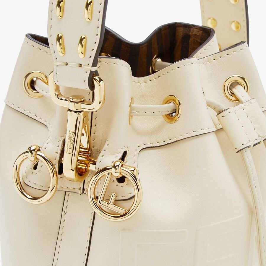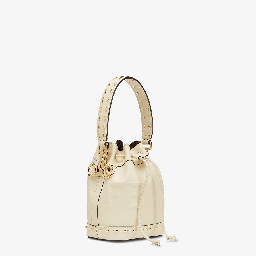 Small Mon Tresor bucket bag in parchment-colored leather with Metal Stitch and embossed FENDI ROMA lettering.Lined in Pequin fabric with gold-finish metalware.Two detachable shoulder straps, one long and one short, to wear the bag over the shoulder or cross-body.Made in ItalyEngth:12, CmHeight:18, CmDepth:10, CmWeight:0,29 KgComposition:100% Calfskin, Inside: 73% Polyester, 27% Polyurethane, Studs: 100% Metal
