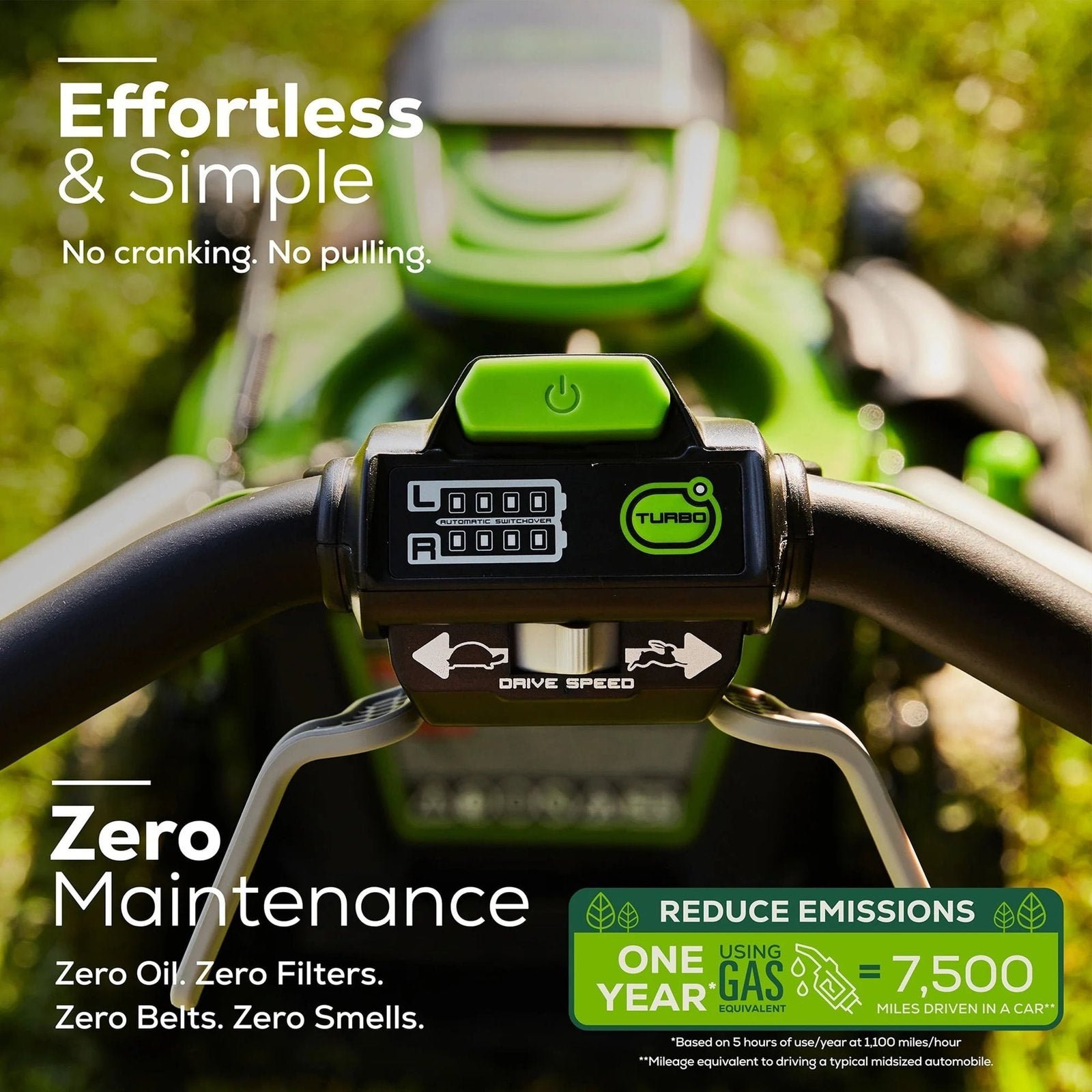 The Greenworks Pro 60V 21″ Cordless Self-Propelled Lawn Mower with (2) 4.0 Ah Batteries & Dual Port Turbo Charger combines battery power with brushless technology to deliver clean, no-fume performance without the hassle of gas, oil or maintenance. Two 4.0 Ah batteries and Auto Switchover provide 60 minutes of runtime and power at the push of a button. Our self-propelled walk-behind mover gives you the option to bag, mulch, discharge or leaf pick up. Select your ideal grass height with the 7-position single-point height adjustment. If you prefer mowing in the early morning or evening hours, high-intensity LED headlights provide the perfect solution. The rear wheel self-propelled system provides increased traction, and the EZ Fold handles quickly fold and store vertically, making it ideal for compact spaces. This lawn mower and the included 5.0 Ah batteries are compatible with the Greenworks 60V system of 75+ tools and batteries.