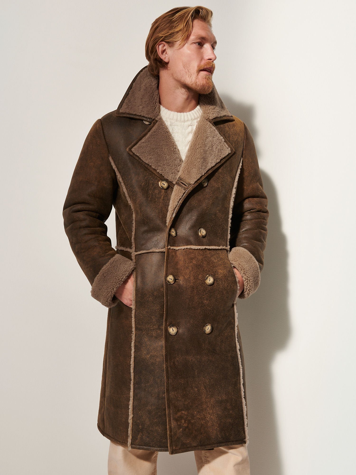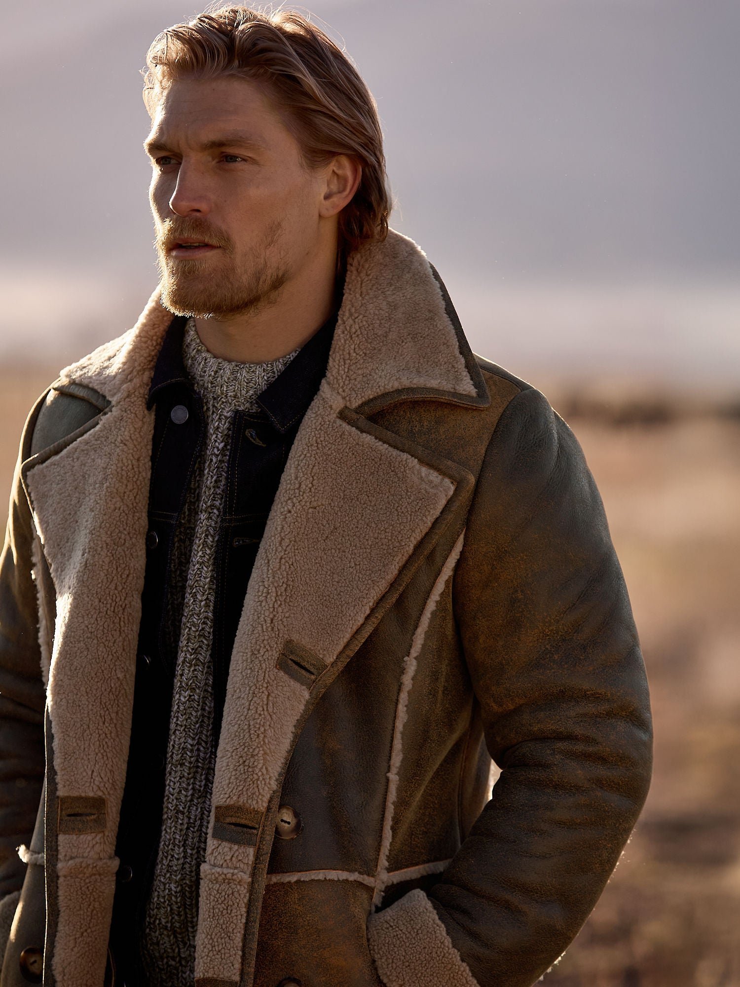 Designed for maximum coverage, the Highlander sheepskin coat is a prime example of fine tailoring and skilled craftsmanship. Its handsome, double-breasted construction, generous notch collar, shearling-out seam lines, and extra length are based on archival designs. A striking presence, this rich shearling coat will reliably shield you from whatever bitter cold you may encounter, whether in the scenic outdoors or under the skyline of a bustling city.