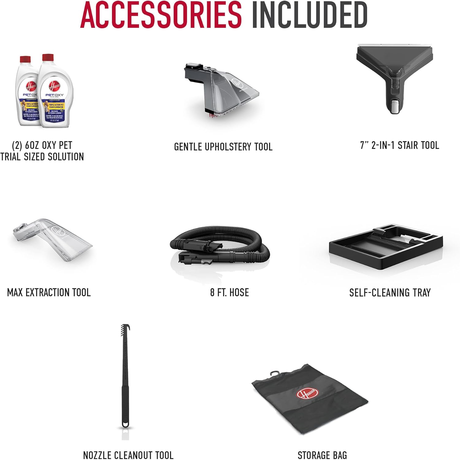 AUTO MIX: This Hoover carpet cleaner machine has an Auto Mix feature that precisely mixes and dispenses solution for optimal carpet washing. Package includes 2-in-1 Pet Tool, Stair Tool, 8 ft. hose, accessory storage bag and sample cleaning solution.