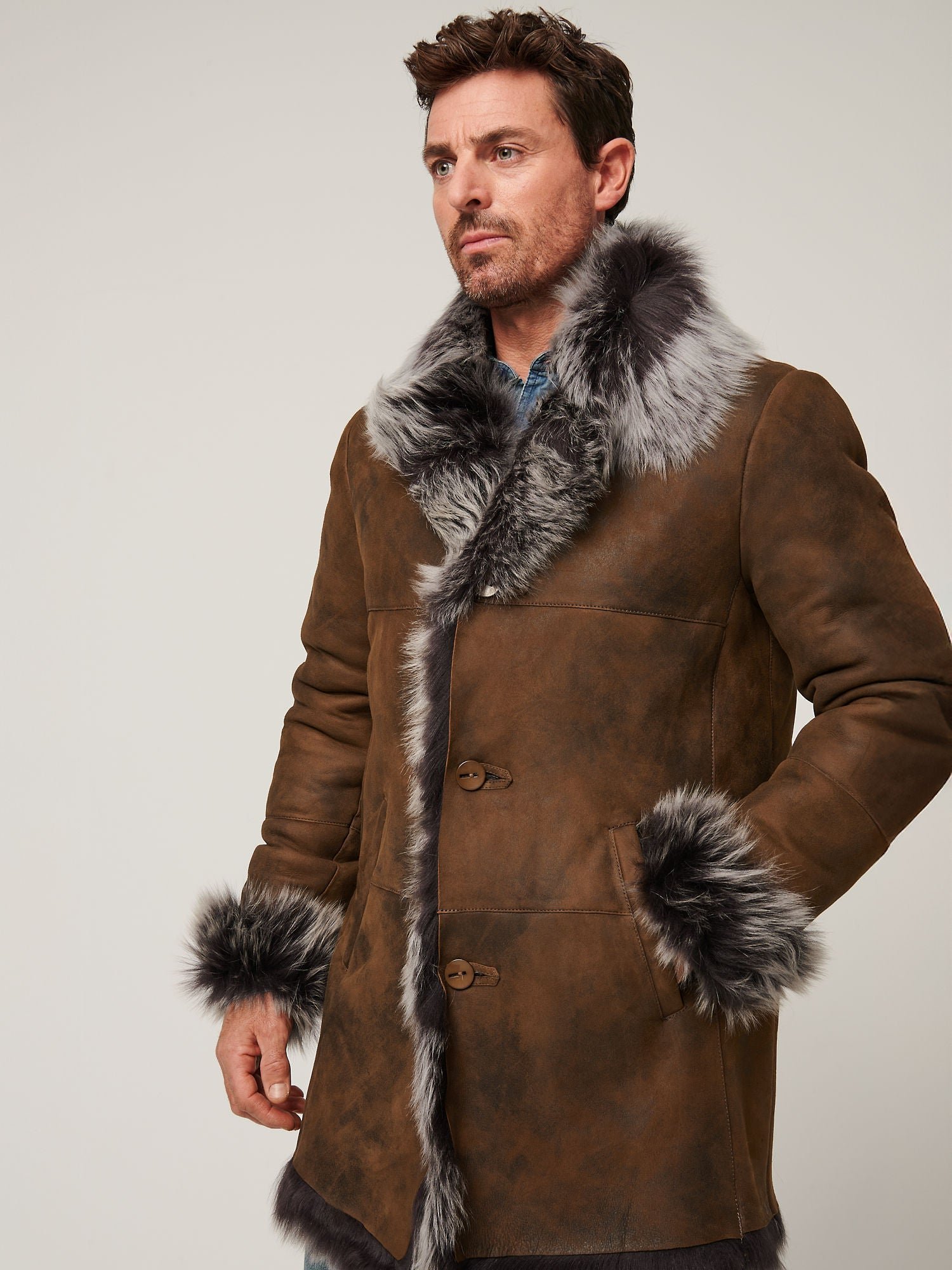 The Jackson sheepskin coat exudes a timeless appeal, from its oversized collar to its rugged raw-edge seams at the cuffs and hem. Touting a longer length, this plush Toscana sheepskin coat is designed for extra coverage and maximum insulation, whether you’re walking the perimeter of the ranch or crisscrossing the jumbled blocks of a modern city.