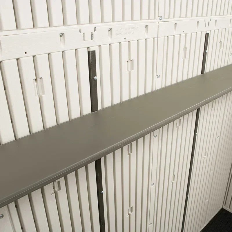 Product Specifications:Delivery Type: Curbside DeliveryEstimated Delivery: 14-21 Business DaysItem Type: ShedsMaterial: ResinModel Number: 60079Product Type: Dual Entry Shedupc: 81483835563Warranty: 10-Year Limited WarrantyWidth: 15’Depth: 8’Construction: Reinforced SteelDoor Style: 2 Double DoorsHeight: 8’Includes: Shed, AccessoriesFrame Type: Reinforced SteelSize: 120 Sq. Ft.Color: Desert SandRust-Resistant: YesWater-Resistant: YesFade-Resistant: YesFire-Retardant: YesMildew/Mold-Resistant: YesUV-Resistant: YesPeak Height: 96″Roof Vent: 2 Screened VentsAssembly Required: YesTools Required (Included or Not): 7/16″ and 3/8″ Wrenches, Mallet, Utility Knife, Phillips and Flat Head Screwdriver, Needle Nose Pliers, Hammer, Safety Goggles, Ladder and Drill with 5/16″ Wood and Masonry Drill Bits (Not Included)Weight: 550 lbs.