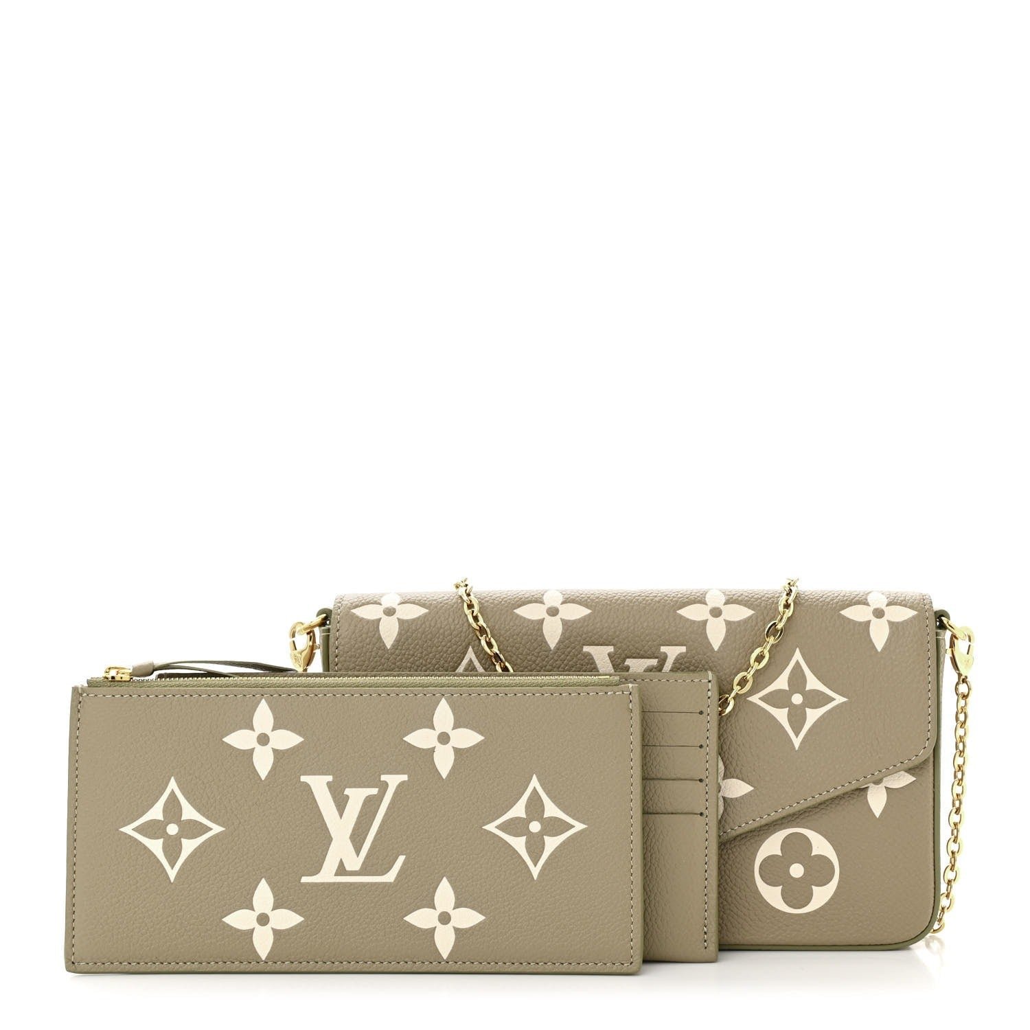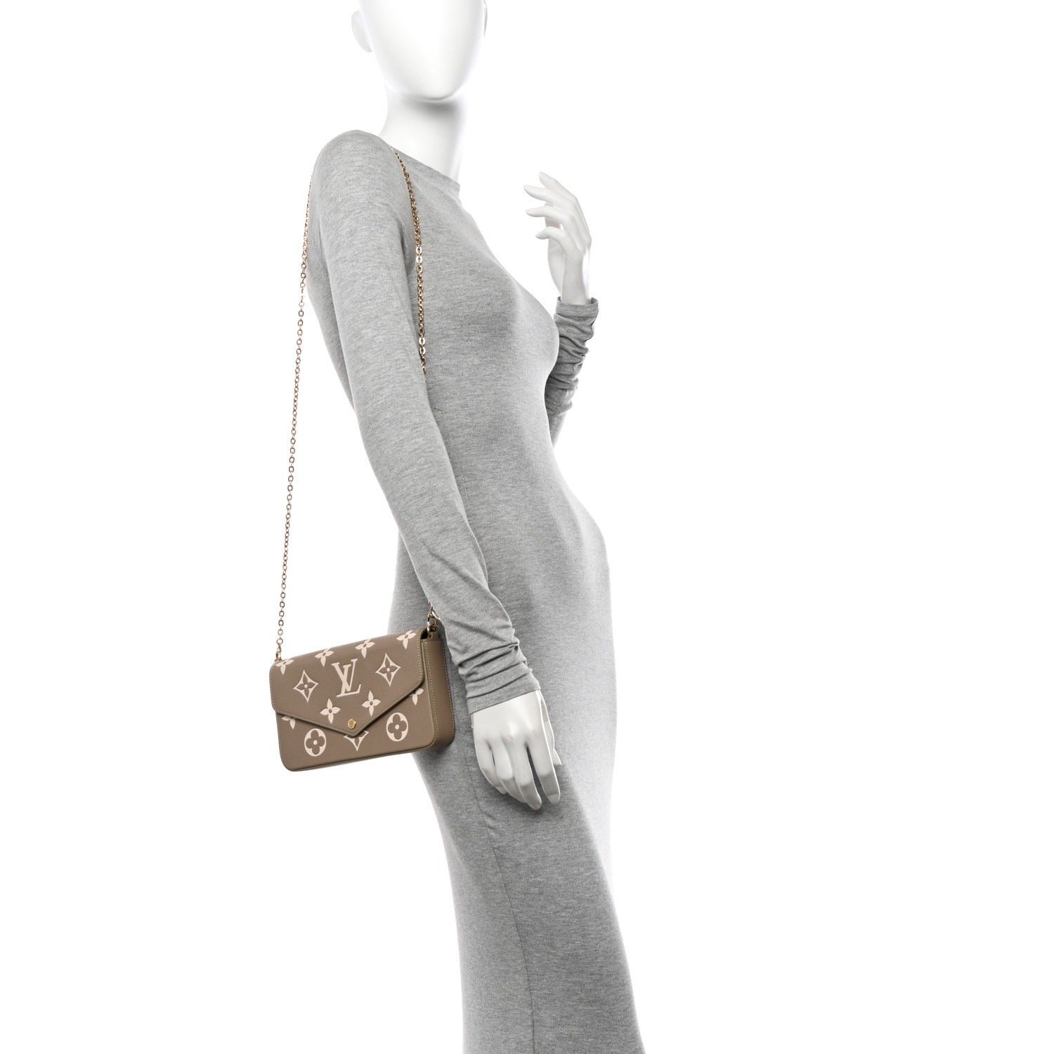 Produced from Tourterelle Gray Monogram Empreinte leather, the Pochette Félicie is Adorned Using a Monogram print at a cream Colour. This fashionable envelope-style pouch comprises two detachable interior pockets. It may be carried as a clutch or worn around the shoulder, as a result of its removable gold-color chain.
