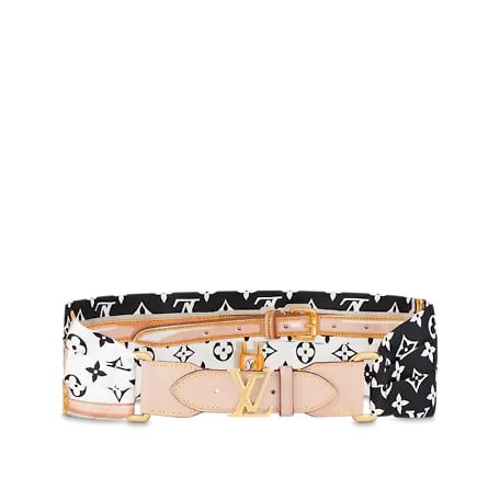 This LV Silk 30mm belt blurs the boundaries between the House’s Leather Goods and Textiles Collections. It is inspired by the much-loved Monogram Confidential square and showcases an intricate Monogram print interwoven with chains, straps and padlocks. The belt’s combination of silk and natural cowhide lends it textural appeal, while the gleaming LV buckle ensures an elegant finish.