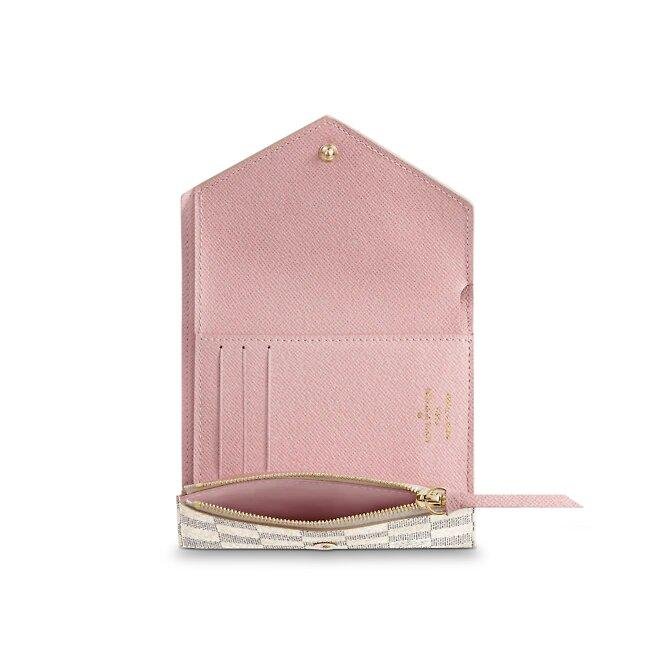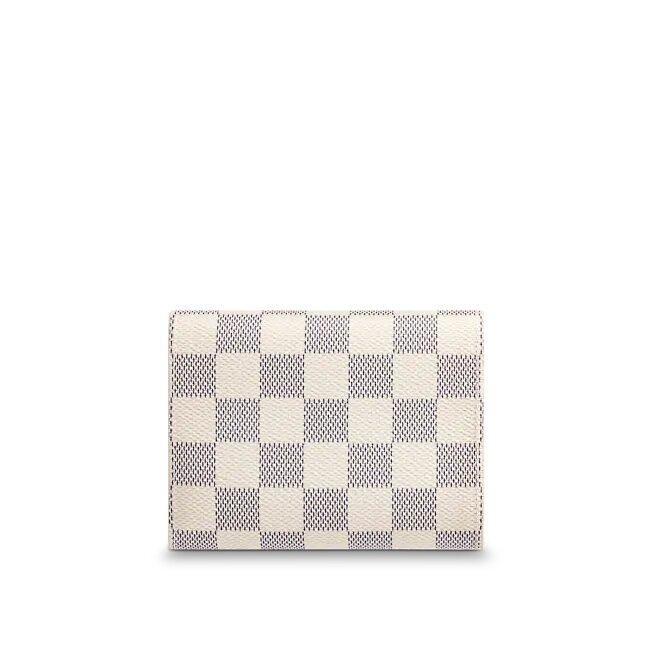 The compact Victorine pockets in Damier Azur canvas combines femininity and capability. It opens out to expose many practical features, which includes card slots and wallet for bills and cash. Its envelope-style flap is sealed with a press-stud, that’s shade-matched with the grained-leather lining.