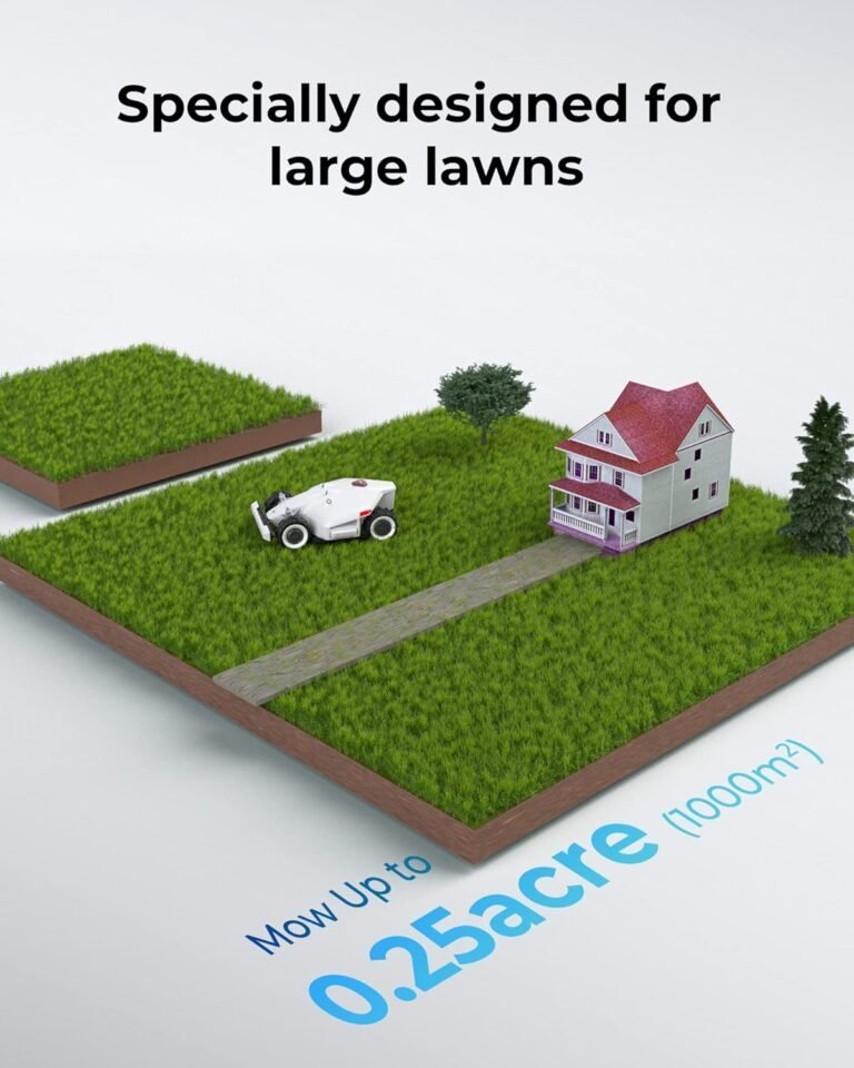 ALL-WHEEL DRIVE FOR 65% SLOPE (33°): Featuring four powerful in-hub motors and exclusive off-road tires and suspensions, LUBA AWD 1000 automatic robot lawn mower boasts outstanding traction and zero-turning agility on complex lawn. Unlike small-diameter wheel mowers, the LUBA AWD 1000 robot mower can effortlessly handle 65% slope (33°) and traverse the most demanding terrain without getting stuck.