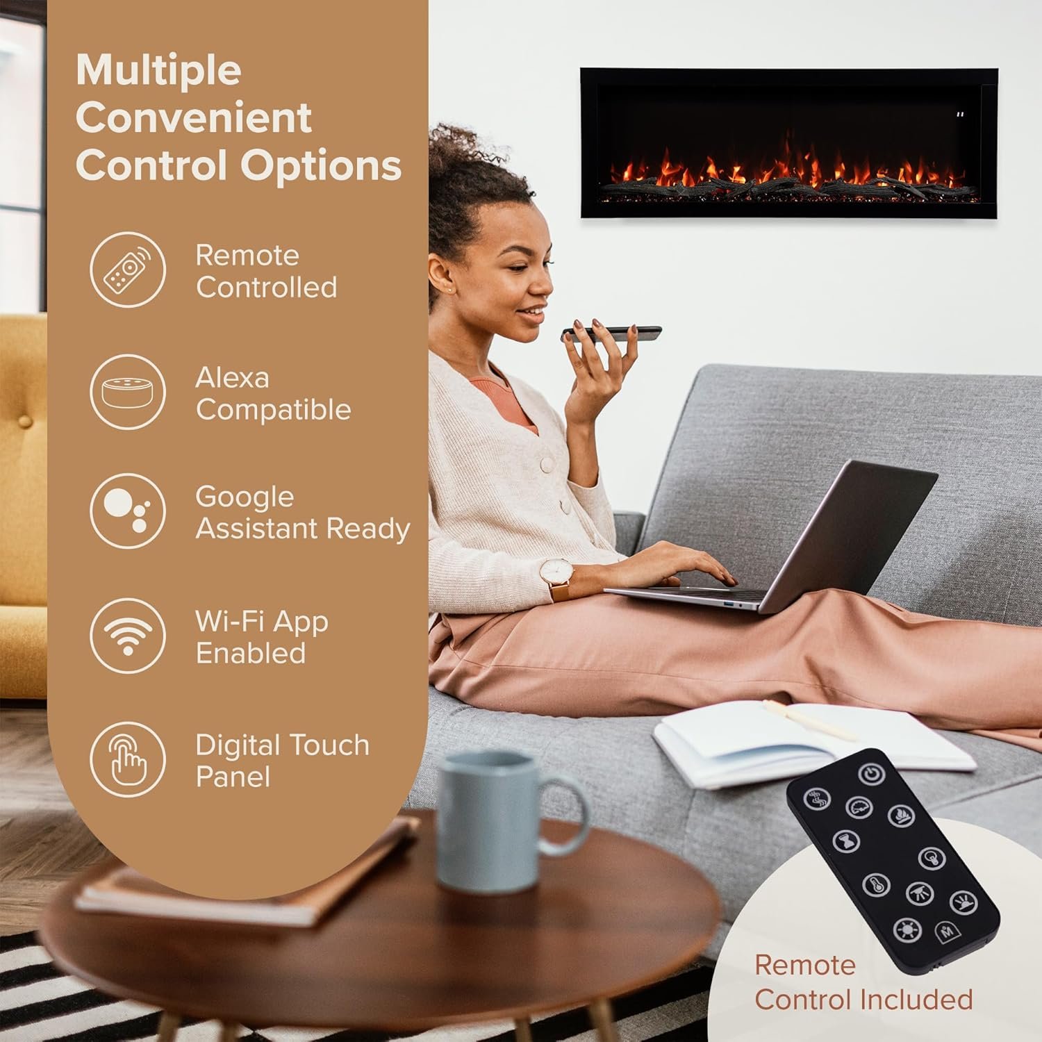Elevate your living space with the Modern Ember Highmark 60-Inch Smart Linear Electric Fireplace, a perfect blend of modern design and advanced technology. Designed for recessed in-wall or wall-mounted installation, this premium electric fireplace offers a sleek hidden vent design and ultra-realistic flame display with 10 customizable flame colors to suit any ambiance.