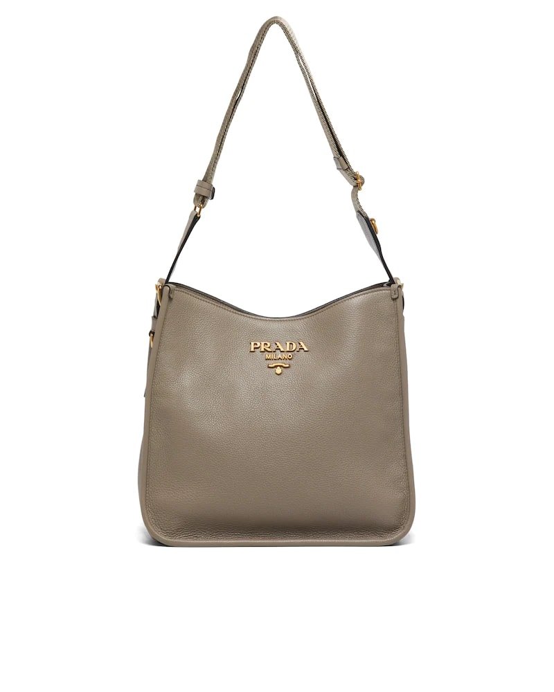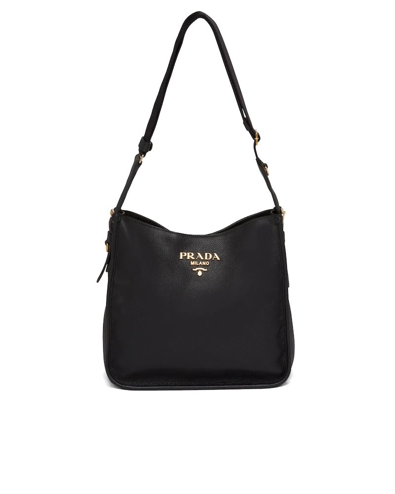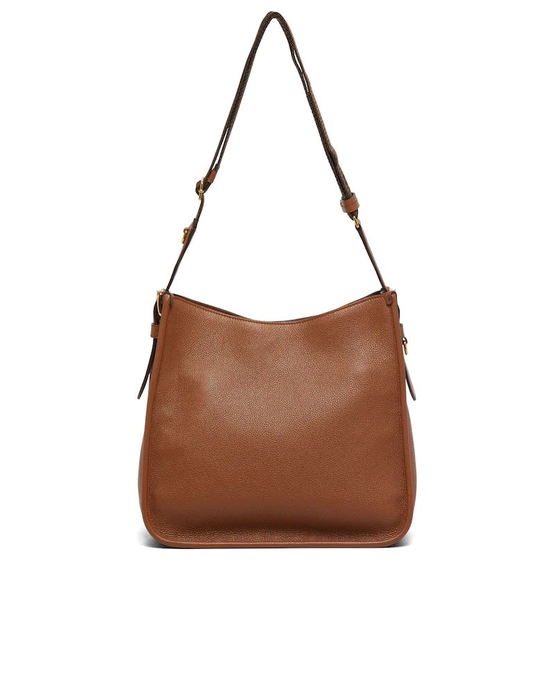 This soft leather hobo bag expressing modern elegance is embellished with the metal lettering logo that illuminates the front and is completed by an adjustable woven fabric and leather shoulder strap.