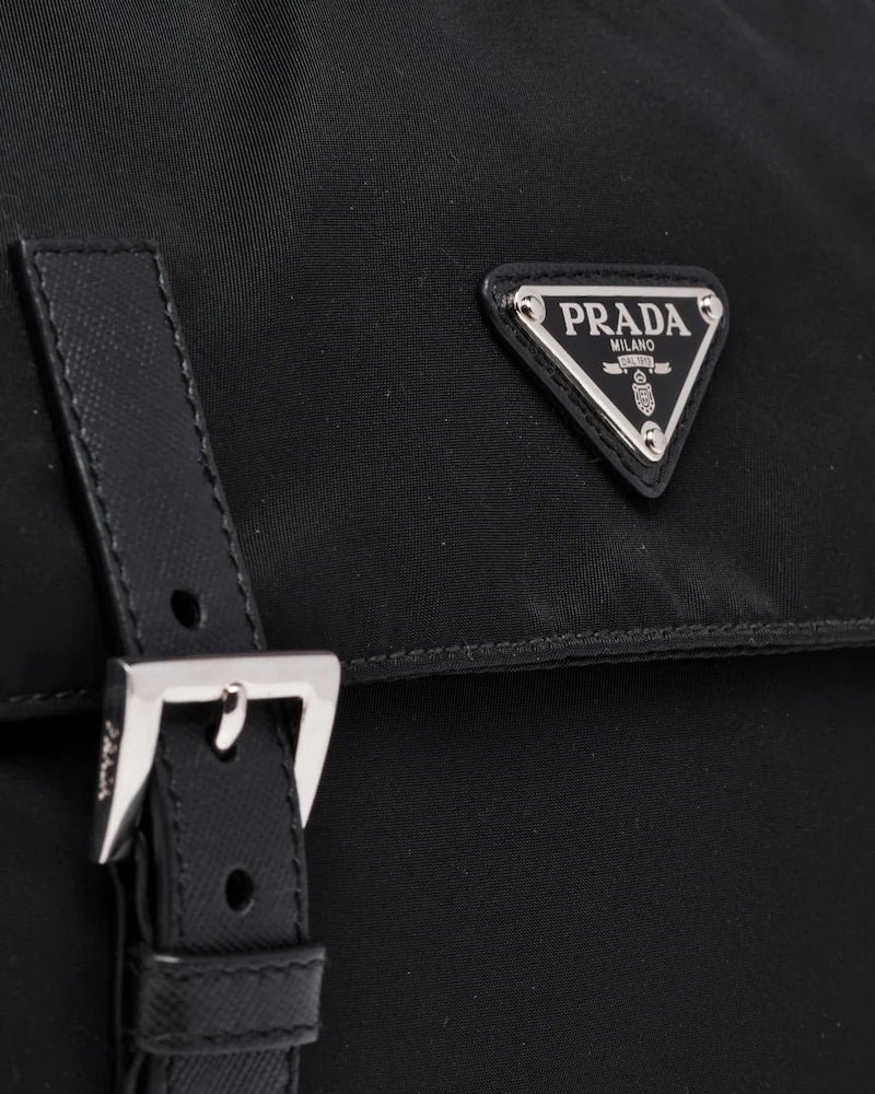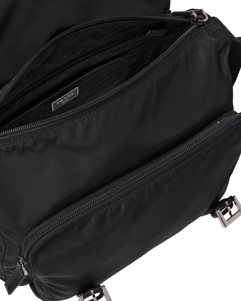 A fabric messenger bag embellished with Saffiano leather detail. It is decorated with the Prada logo and steel hardware, and features various pockets, inside and out, accented with Prada logo lining.