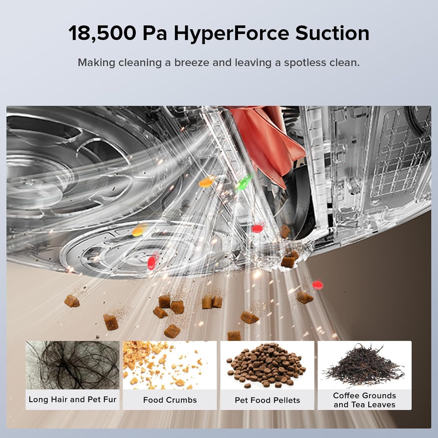 Unmatched Cleaning Power: With up to 18,500 Pa strong suction, it easily overcomes all cleaning challenges, powerfully lifting hair, debris, dust, and dirt from carpets and hard floors into the dustbin.