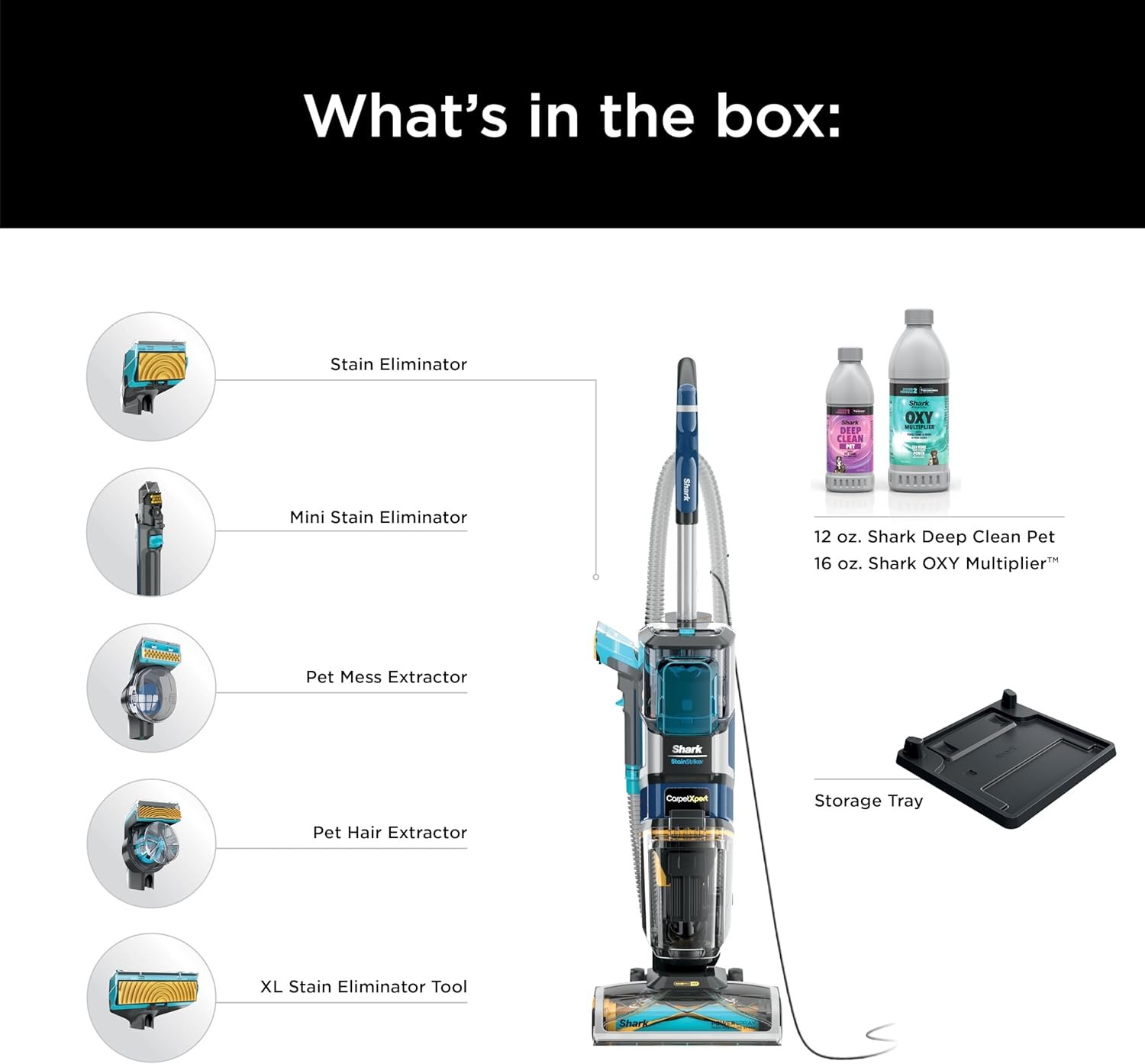 Shark CarpetXpert with StainStriker is an upright carpet & upholstery cleaner, combining dual-activated formula and ultra-powerful suction to remove stains, dirt & grime – perfect for pets and whole-home cleaning.