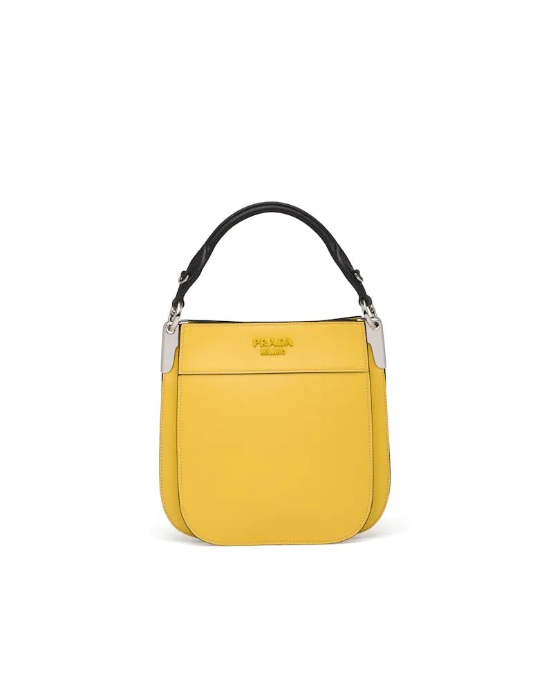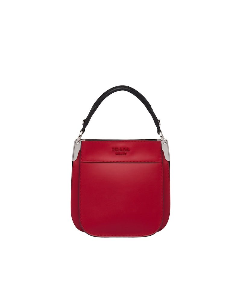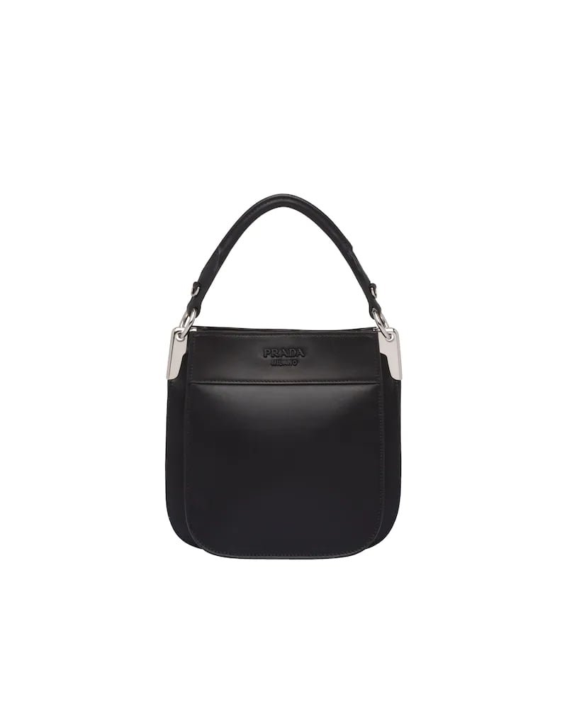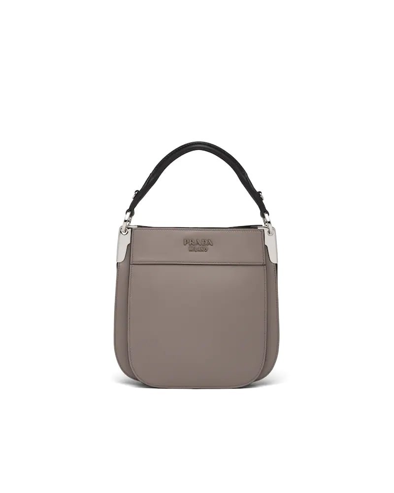 The curvy line of its silhouette distinguishes the Prada Margit handbag. The leather bag has two internal compartments and the metal lettering logo.