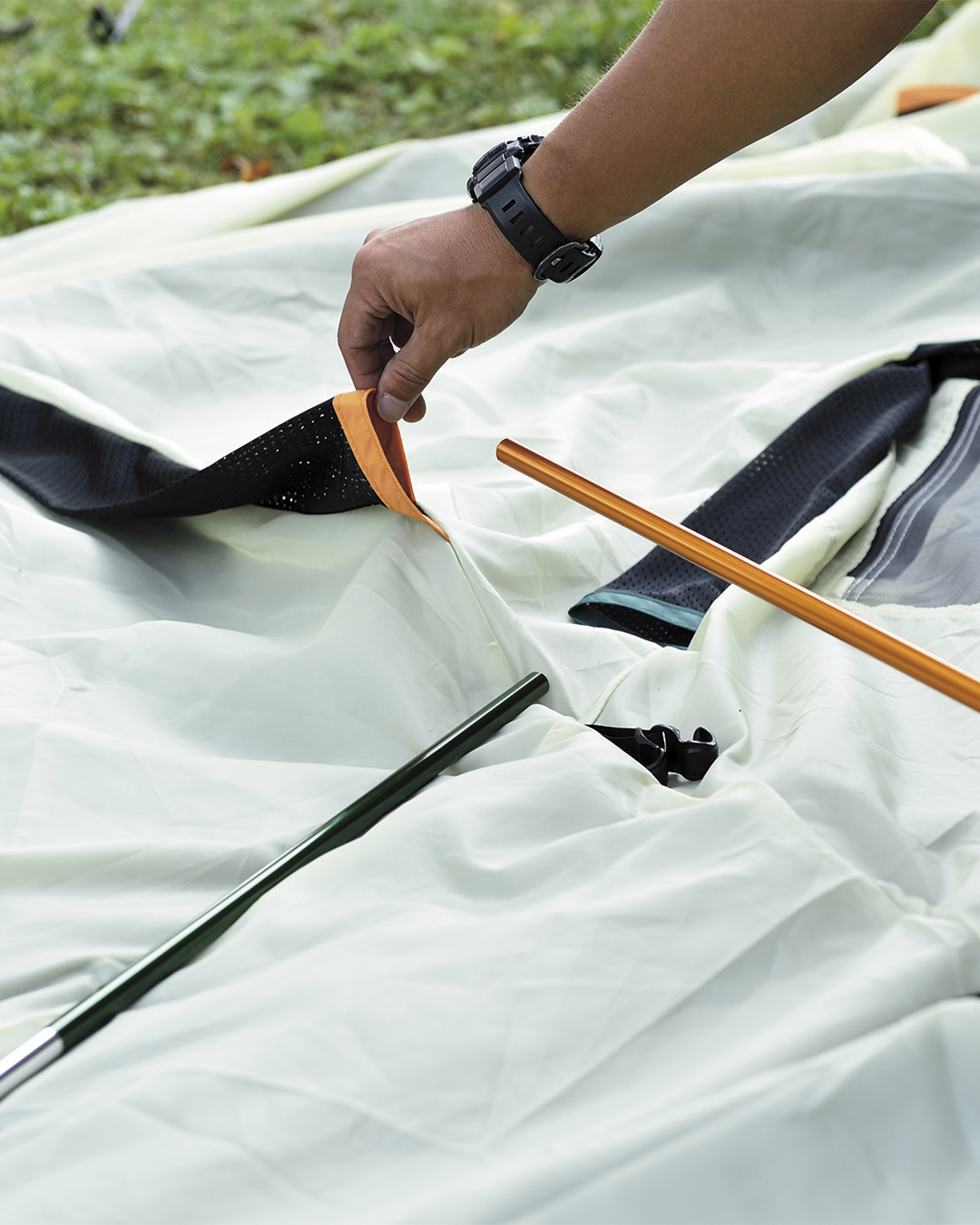 Materials: Fly Sheet: 75D Polyester, PU Coating 1,800mm, Teflon Water Repellent, UV Cut Processing, Inner Tent: 68D Polyester, Bottom: 210D Polyester Taffeta, PU Coating 1,800mm, Frame: Duralumin
