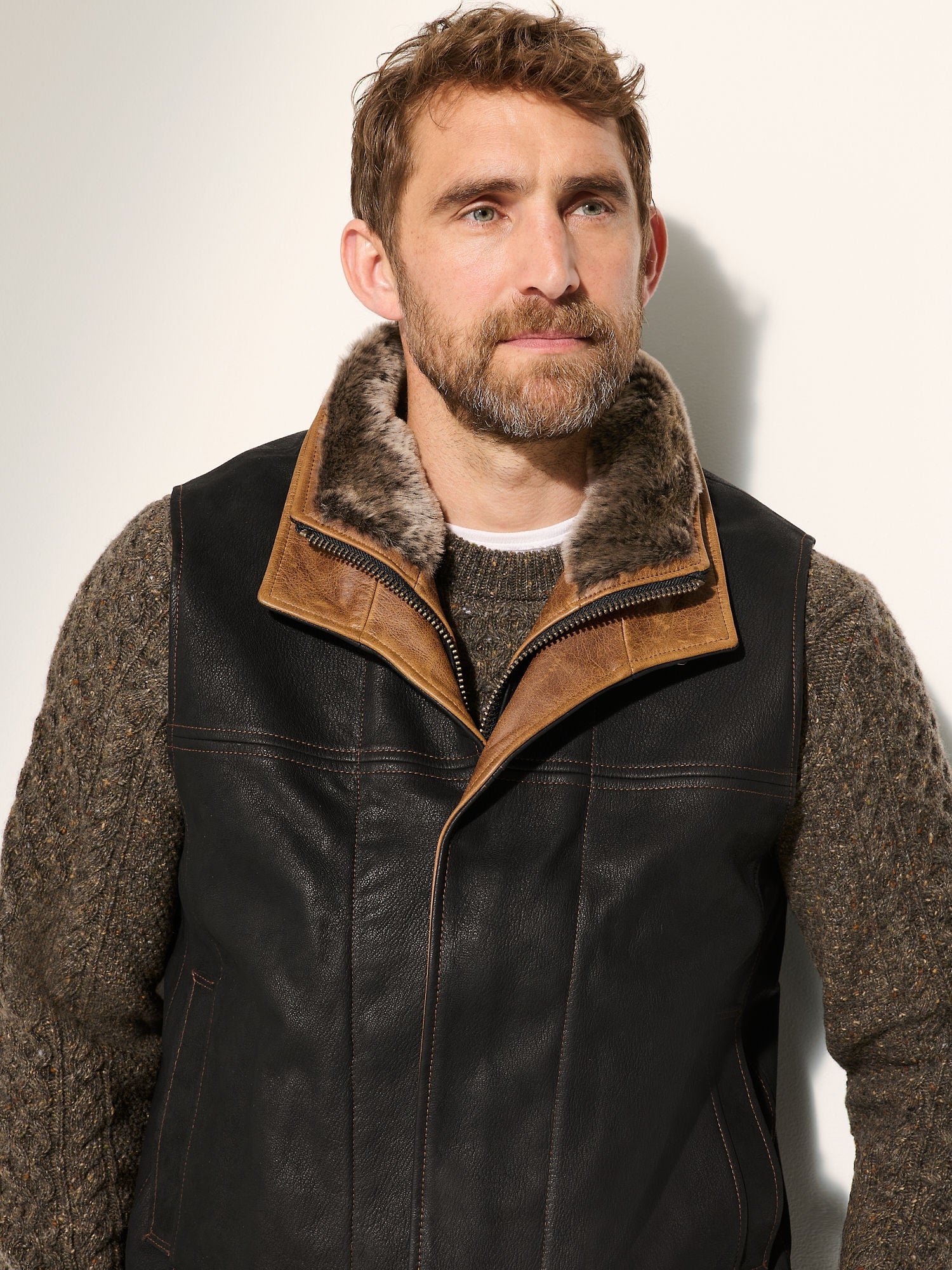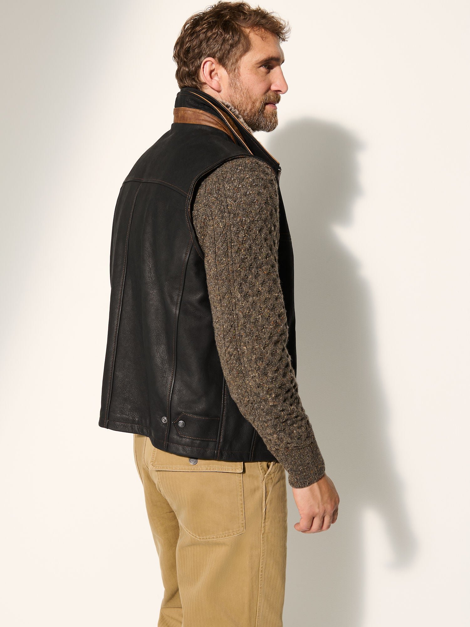 The Trekker takes you on outdoor adventures with city style. From the buckle-tab collar to the adjustable waist tabs, the Trekker vest dresses you in luxurious Kildare goatskin leather that’s robust yet supple, with a gentle pebble grain and understated good looks. The removable zip-front leather bib with a Merino shearling-lined collar adds insulation and a rugged dual-collar design. This durable snap-front vest is finished with hand pockets and wool blend lining for comfortable outdoor wear.