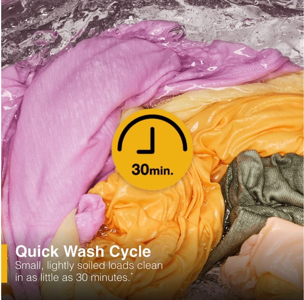 Quick Wash Cycle – Cleans small, lightly soiled loads in as little as 30 minutes.* Based on a 3-lb load