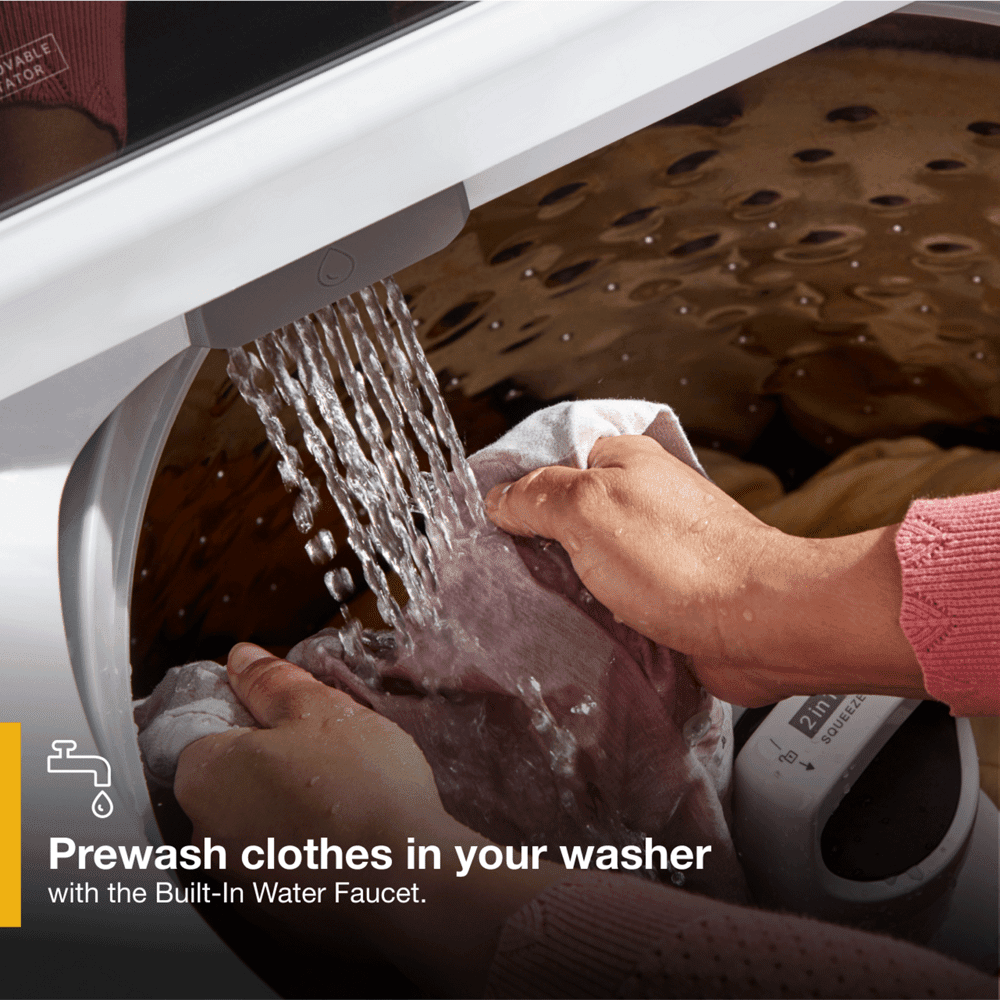 The Whirlpool WTW5057LW is a versatile 4.7 – 4.8 Cu. Ft. Top Load Washer featuring a 2-in-1 Removable Agitator that can be taken out for added space. The washer offers a built-in water faucet for stain pretreatment and a Deep Water Wash Option. With an Easy-View™ Slow Close Glass Lid, it accommodates large loads. This washer reflects Whirlpool’s legacy as an American company for over a century. It weighs 120 pounds and measures Depth: 27”, Height: 41 1/2”, Width: 27 3/4”.